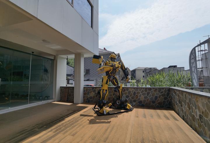 美在错愕中:在余村的“共富后巷”,在一排乡村别墅前,突然矗立着一个汽车机器人——大黄蜂,仿佛在看家护院,细看才知是浙大的机器人研学基地。