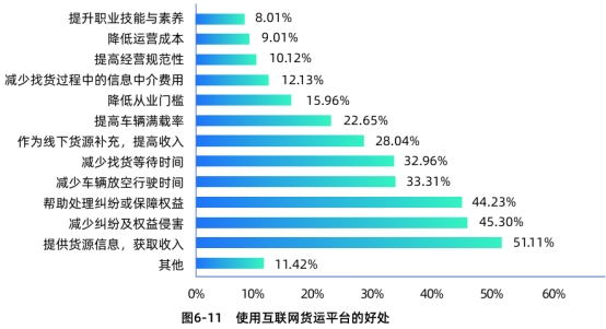 与此同时,报告还调查了货车司机对互联网货运平台带来的好处的主观评价。司机对互联网货运平台价值的核心认知集中在四个方面:提供货源信息与收入来源、减少纠纷及权益侵害、帮助处理纠纷或权益保障、减少找货等待时间、减少空驶率。在调查中,接近一半的货车司机认为平台保障司机权益方面提供了相应的帮助。