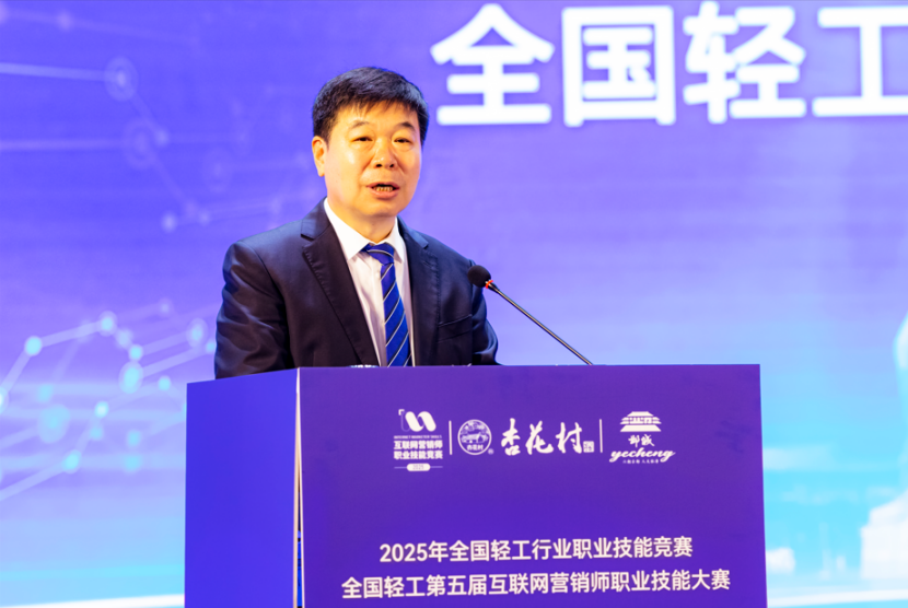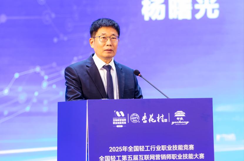 杨曙光代表大赛组委会致辞。他表示,互联网营销作为数字经济与实体经济深度融合的重要载体,已成为激活轻工产业发展动能的关键引擎。我国90%以上的中小微企业集中于轻工领域,互联网营销凭借其跨越地域的传播优势,通过直播带货、短视频推广等形式,有效连接生产、流通与消费环节,为行业高质量发展注入强劲活力。