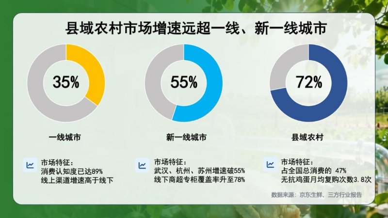 同时,京东数据显示,2024年县域农村无抗食品的市场增速达72%,远超一线城市。这类消费者愿意为“适度健康溢价”买单,无抗鸡蛋的月均复购次数达3.8次,显示出下沉市场对高品质健康食品的旺盛需求。