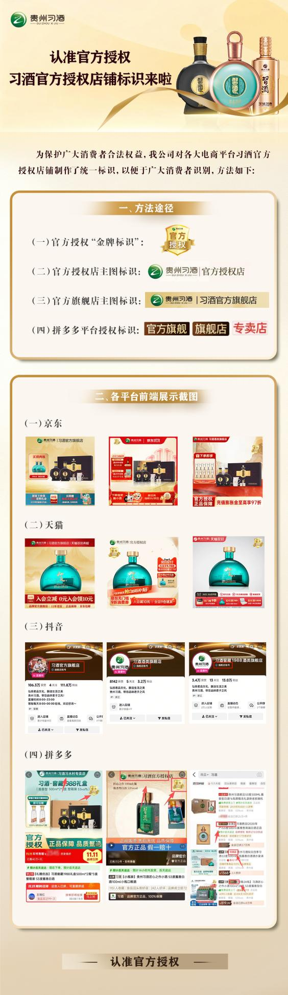 因此,在选购习酒产品时,认准官方授权认证店铺就显得尤为关键,这不仅是免受非正规产品侵扰的重要保障,更是切身保护合法权益的有效举措。那么,作为普通消费者,面对纷繁复杂的网络店铺,究竟该如何快速识别出官方授权认证店铺呢?别着急,以下来自官方的“干货”,你一定能用得上!