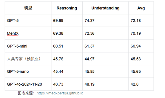 评测结果显示,MentX在“多模态推理”(Reasoning)和“医学理解”(Understanding)两项核心指标上分别取得69.38%和72.36%的高分,综合成绩仅次于GPT-5(72.18%),领先GPT-4o(42.8%)、GPT-5-mini(60.94%)及人类预执业专家平均水平(45.53%)。