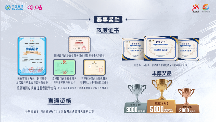“我要上智运”全民棋牌全国网络大赛由国家体育总局群体司、中华全国体育总会群体部、国家体育总局棋牌运动管理中心、咪咕文化科技有限公司及各大棋牌协会联合主办,是首个全国智力运动会配套的综合性网络赛事,本届总决赛冠军选手将直通2027年全国智力运动会,围棋、五子棋优胜选手可申报段位证书,象棋优胜选手可申请等级证书,桥牌项目优胜选手将授予金分,为选手的竞技之路提供权威认证。