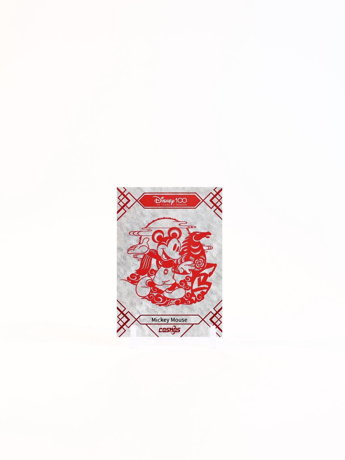 这款产品将球星卡中的收藏语言逻辑和材质应用于非体育IP,同时融入中国元素,如米奇与十二生肖的结合,以及镭射效果的太极八卦图案。