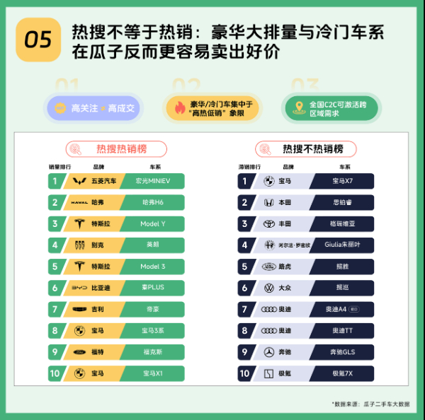 5、热搜不等于热销:豪华大排量与冷门车系在瓜子反而更容易卖出好价