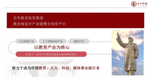 光华教育集团成立于2019年,总部坐落于济南、北京、杭州三地,是一家以教育产业为核心,人力资源、人工智能科创、媒体产业为配套的教育规划全产业链整合服务平台。集团推行“3+2”战略性业务布局,打造了覆盖基础教育、高等教育、职业教育、国际教育的一站式升学规划及就业全链条服务体系,致力于成为中国教育、人力、科创、媒体事业的践行者。