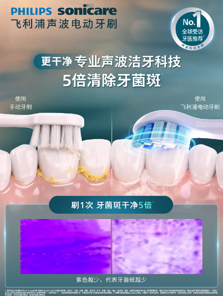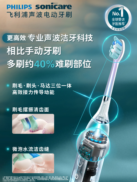 ——更高效!飞利浦33年专业声波洁牙科技,三位一体科技高效接力传导动能,2分钟多刷40%难刷部位。