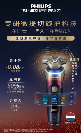 新春将至,全球电动剃须刀领导品牌飞利浦重磅上市一款高端剃须刀——旋护新9系Ultra新意限定版,依托飞利浦超85年的男士理容经验与专研的微提切旋护科技,实现-0.08mm根源净剃,搭载SkinIQ Pro水感微珠舒适圈,减少50%对皮肤的摩擦,做到“净护合一”。