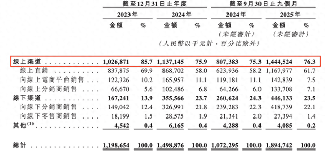 招股书显示,公司依赖小红书、抖音、天猫、京东等第三方电商平台进行线上销售。数据显示,2023年、2024年及2025年前9个月,公司来自线上渠道的销售收入分别为10.26亿元、11.37亿元和14.44亿元,占公司同期总收入的85.7%、75.9%和76.3%。
