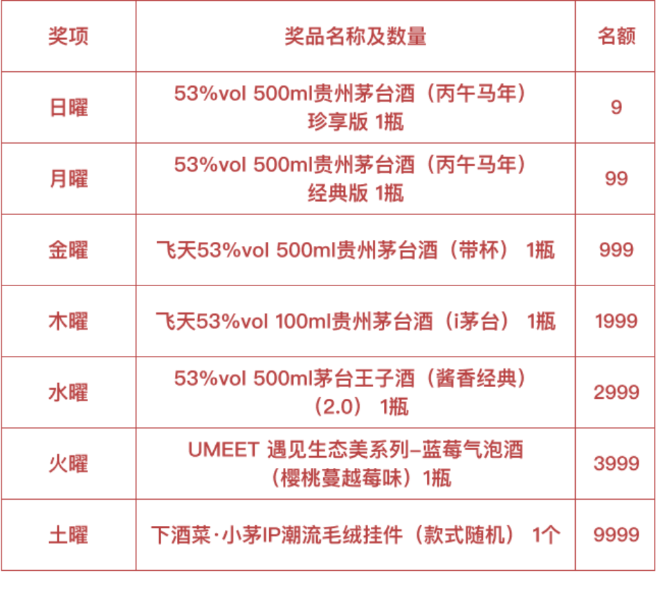 2月16日09:00-3月3日23:59,小茅将在i茅台APP开启“策马纳千祥 春节不打烊”有奖问卷活动。活动期间,可登录i茅台APP,通过点击首焦、弹窗等方式进入活动页面参与答题,完成问卷后即可获得抽奖资格。届时,系统将自动通过区块链进行抽奖,抽奖结果由第三方权威机构进行公证。参与者有机会抽取以下奖品: