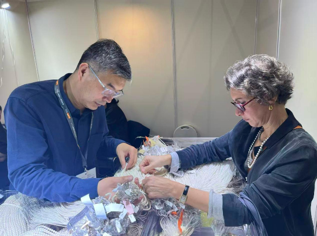展会现场,珍珠胸针、吊坠、项链、耳饰等饰品琳琅满目、工艺精湛,吸引大量国际采购商洽谈合作。据介绍,山下湖珍珠此次参展旨在构建“买全球、卖全球”贸易格局:一方面推动中国珍珠拓展海外市场,力争出口订单实现新突破;另一方面精准对接澳白、akoya、大溪地等海水珍珠资源,丰富国内市场供给,提升“中国珍珠之都”全球集散辐射能力,加快打造国际知名珍珠贸易中心。