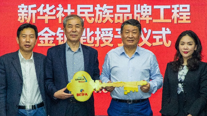 新华社民族品牌工程办公室常务副主任宗焕平向贝发集团董事长邱智铭授予加入新华社民族品牌工程“金钥匙”,希望这把“金钥匙”打开品牌赋能的大门,探寻品牌提升的新路径。