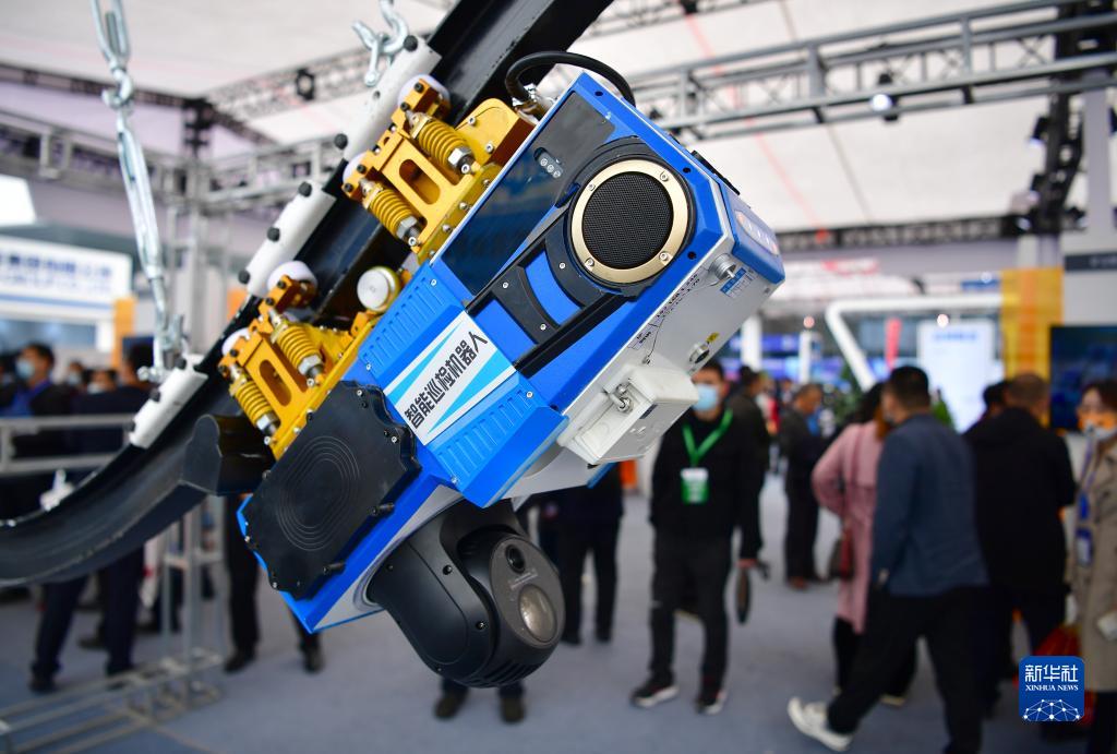 10月13日,观众在展会上参观一款轨道式智能巡检机器人。 新华社记者 邵瑞 摄