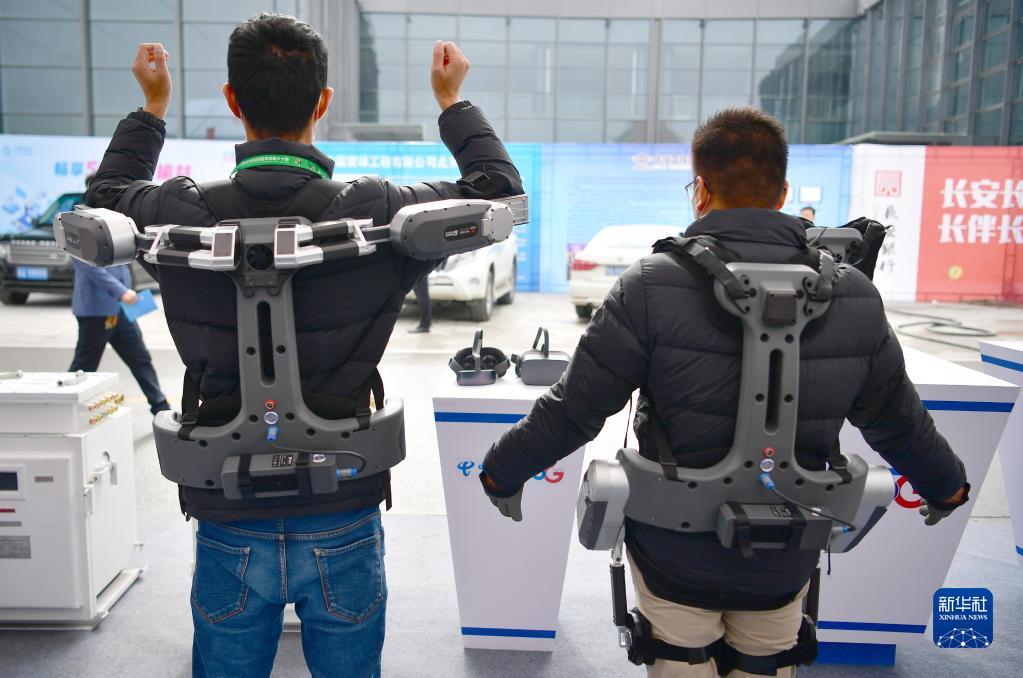10月13日,一家企业的工作人员在展位上演示矿用外骨骼机器人。 新华社记者 邵瑞 摄