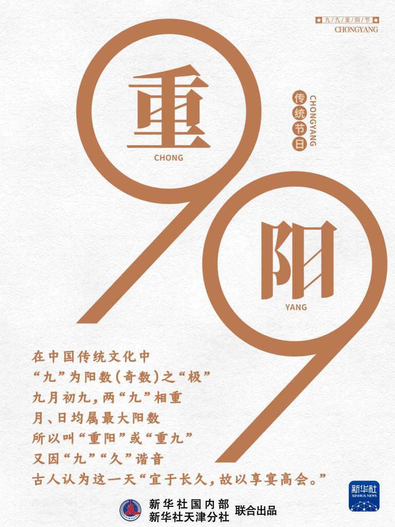 在中国传统文化中,“九”为阳数(奇数)之“极”,九月初九,两“九”相重,月、日均属最大阳数,所以叫“重阳”或“重九”;又因“九”“久”谐音,古人认为这一天“宜于长久,故以享宴高会。”