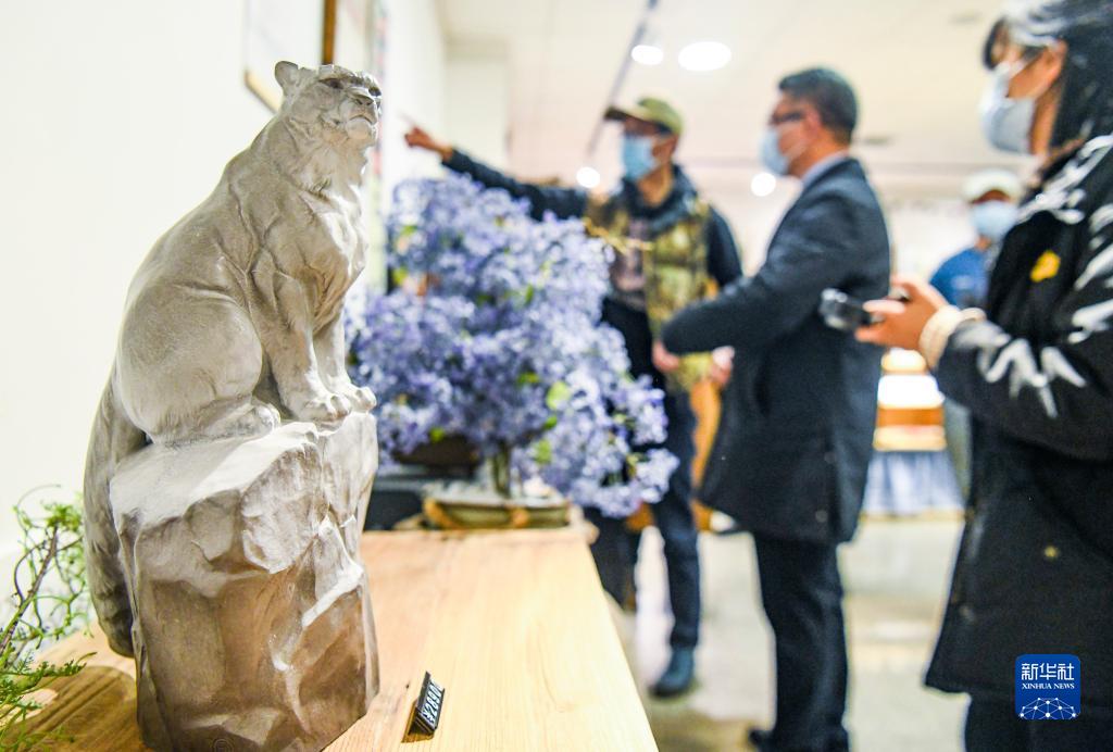 10月23日,观众在乌鲁木齐参观雪豹主题雕塑作品。 当日是“世界雪豹日”,一场雪豹主题艺术展在新疆乌鲁木齐市举办,展览展出了以雪豹为主题的绘画、雕塑、文创产品等。 新华社记者 王菲 摄