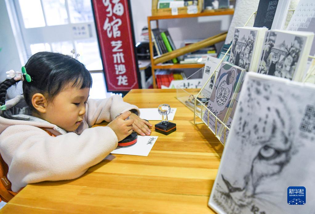10月23日,一名小女孩在雪豹主题绘画明信片上加盖主题印章。 新华社记者 王菲 摄