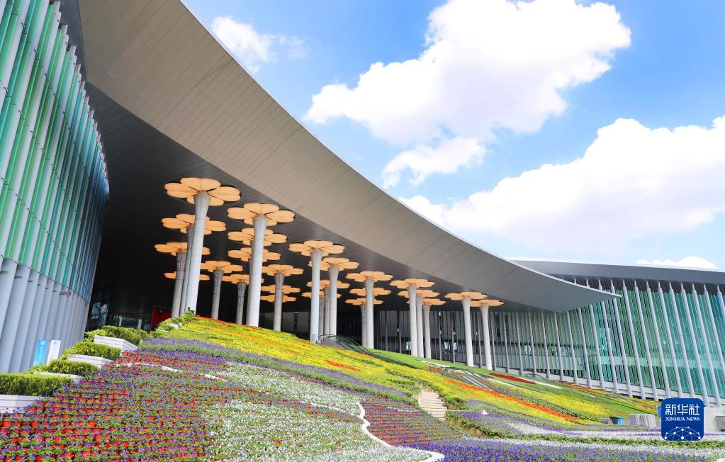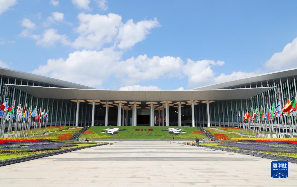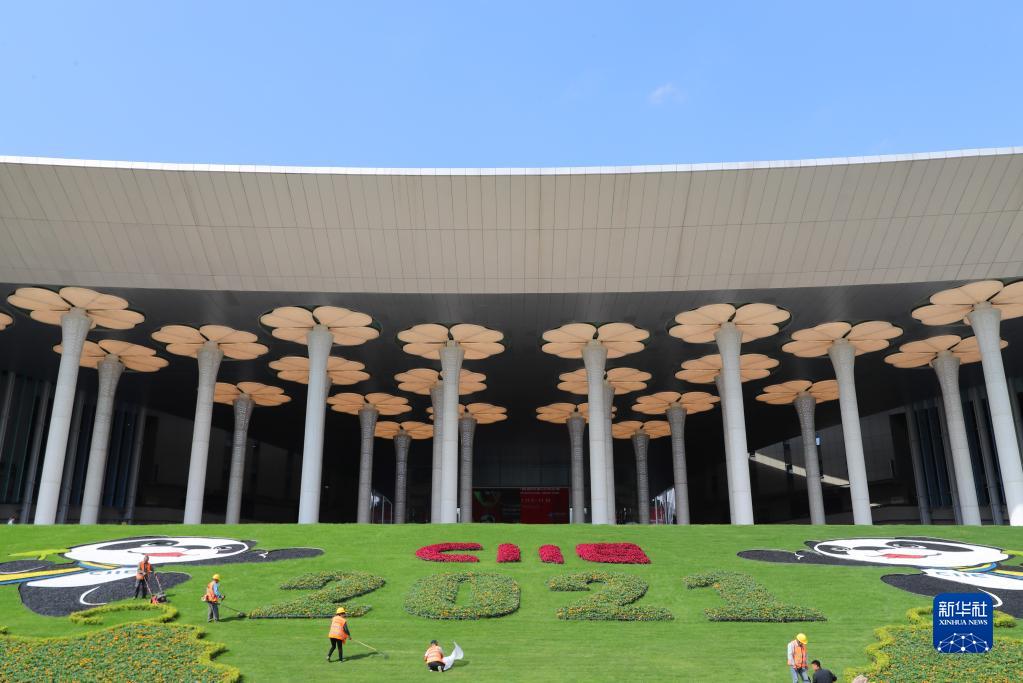 10月23日拍摄的国家会展中心(上海)南广场。 目前,国家会展中心(上海)南广场绿化和鲜花装饰工程基本完成,静待进博会开幕。 新华社记者 方喆 摄