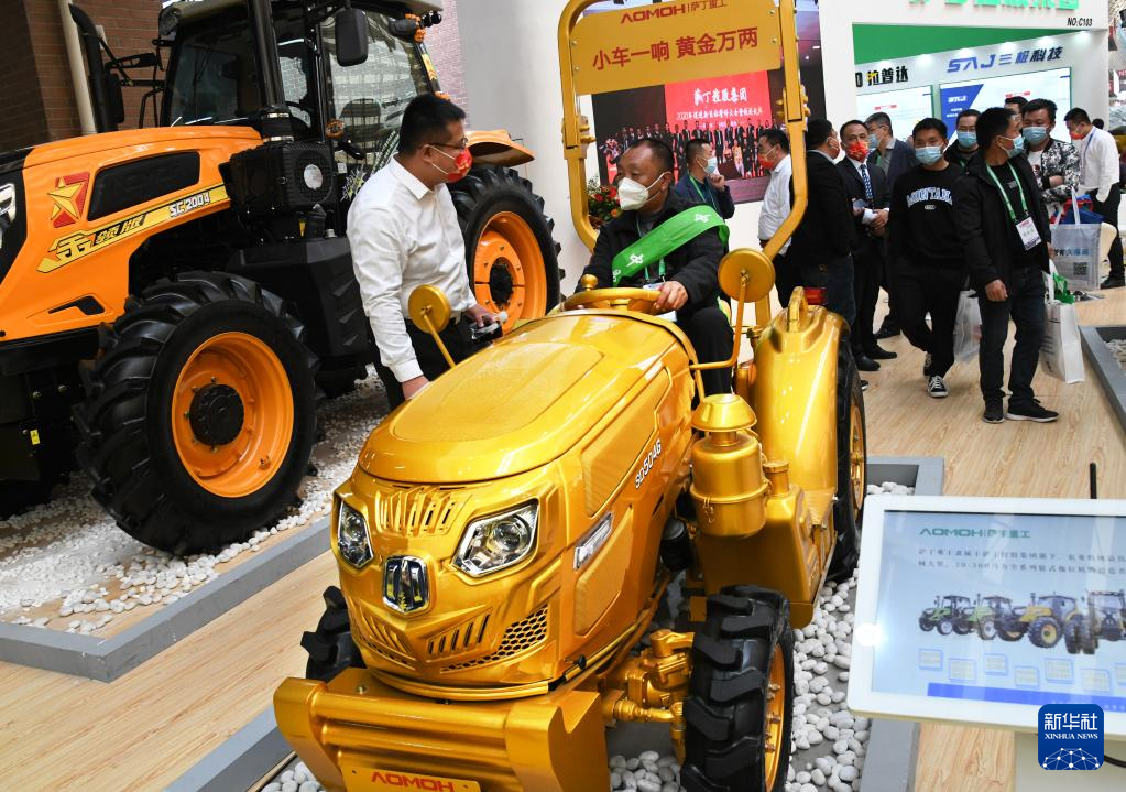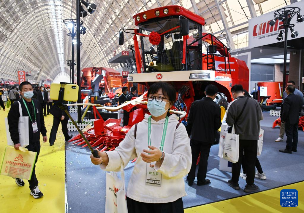 10月26日,参观者在展会上体验农机。 新华社记者 李紫恒 摄