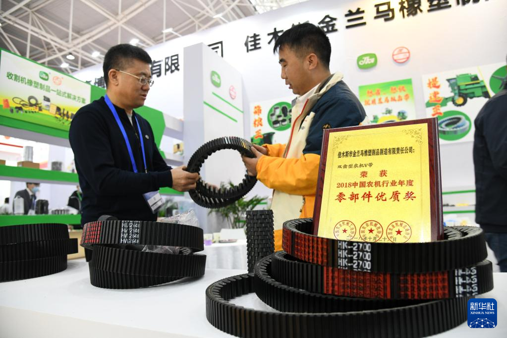 10月26日,参观者在展会上了解出口农机配件。 新华社记者 李紫恒 摄