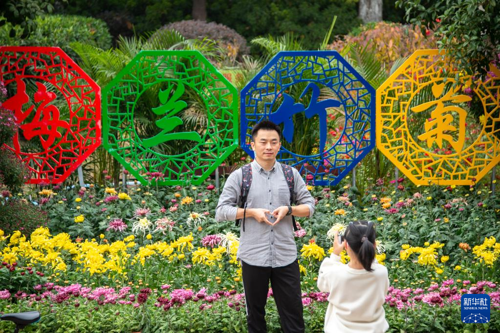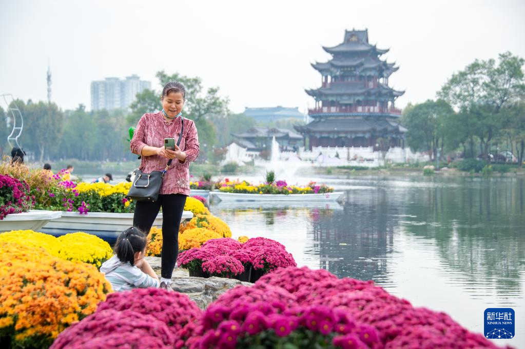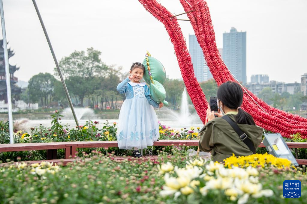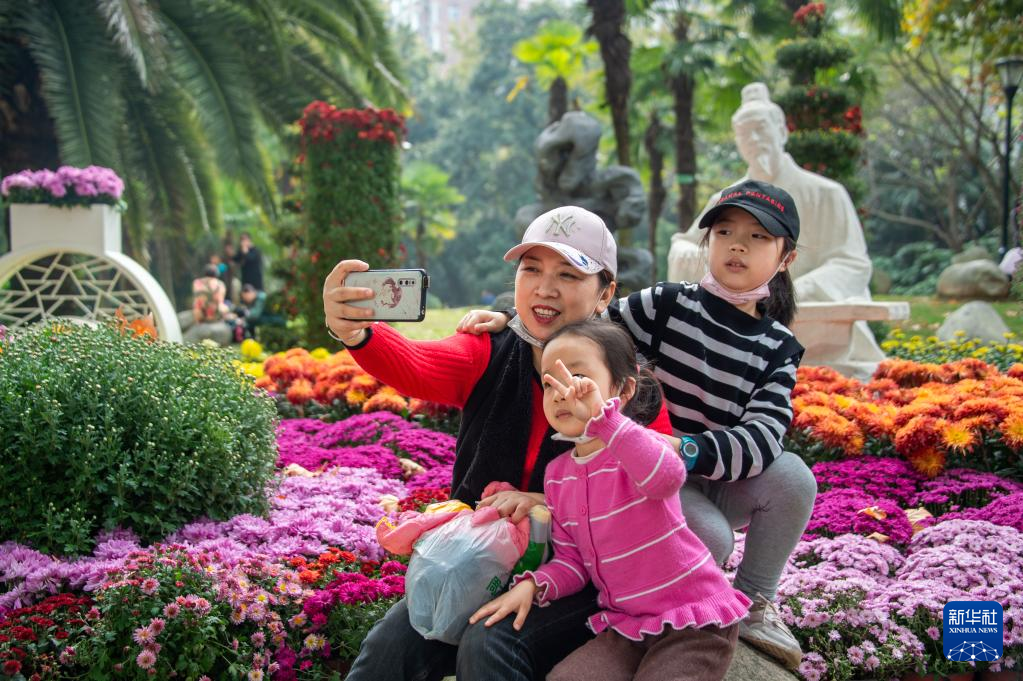 10月31日,游客在武汉琴台绿化广场赏菊拍照。 新华社发(伍志尊摄)