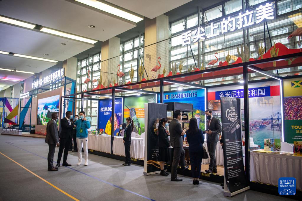 11月16日,参会嘉宾在第十四届中国—拉美企业家高峰会合作展上交谈、参观。 新华社记者 唐奕 摄