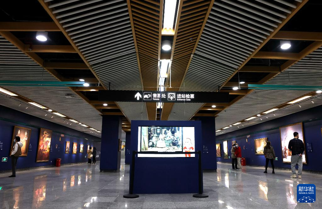 11月25日,人们在上海地铁龙华中路站站厅欣赏展品。 近日,西班牙普拉多国家博物馆部分馆藏画作以原尺幅复制品的形式亮相上海地铁龙华中路站站厅,供过往乘客近距离欣赏。 新华社记者 陈飞 摄