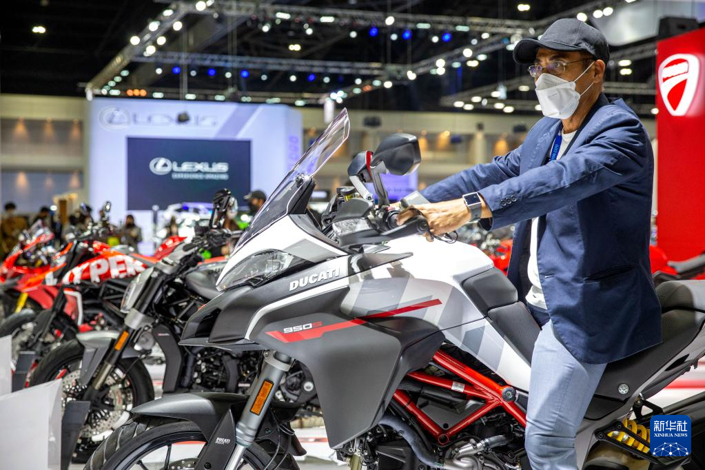 12月1日,一名男子在泰国曼谷举行的第38届泰国国际车展上试骑摩托车。 新华社记者 王腾 摄