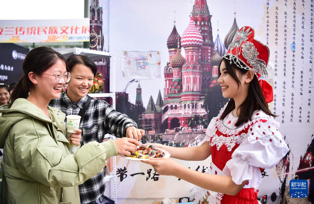 12月3日,学生在四川外国语大学2021国际文化节展览上参观体验。 当日,四川外国语大学2021国际文化节拉开帷幕。本次文化节以“ ‘一带一路’文明互鉴:多语共生 多元共融”为主题,包括舞台表演和展区展览两个部分。 新华社记者 王全超 摄