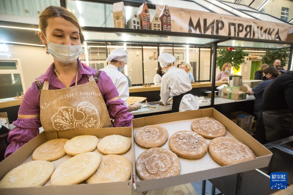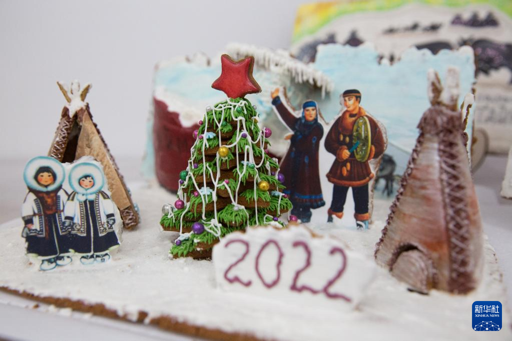 12月18日,工作人员在俄罗斯圣彼得堡举办的姜饼节上展示制作的姜饼。 圣彼得堡第六届姜饼节于2021年12月12日至2022年1月9日举行。 新华社发(莫京娜 摄)