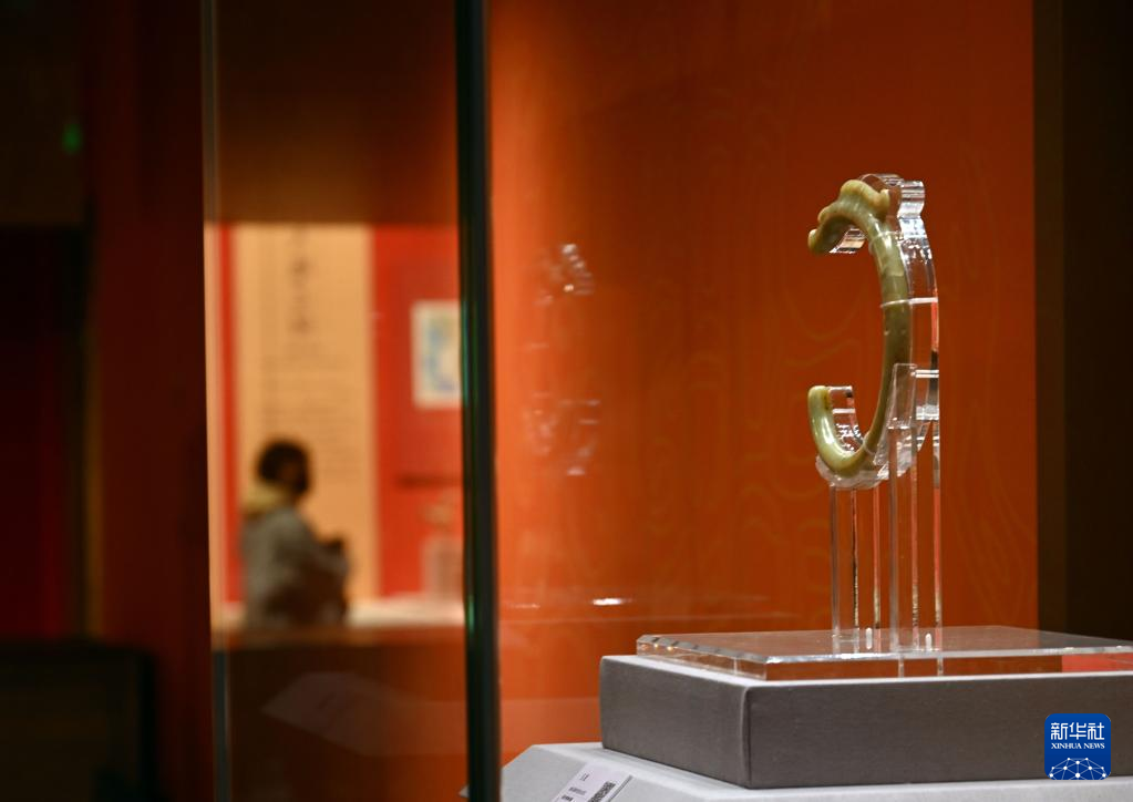 这是展出的玉龙(1月25日摄)。 1月25日,由国家文物局指导的“何以中国”展在北京故宫文渊阁开幕。本次展览共展出珍贵文物130余件/套,包括石器、陶瓷、玉器、青铜器、金银器等类别,分为“源”“流”“汇”三个单元。 新华社记者 金良快 摄