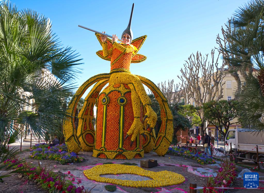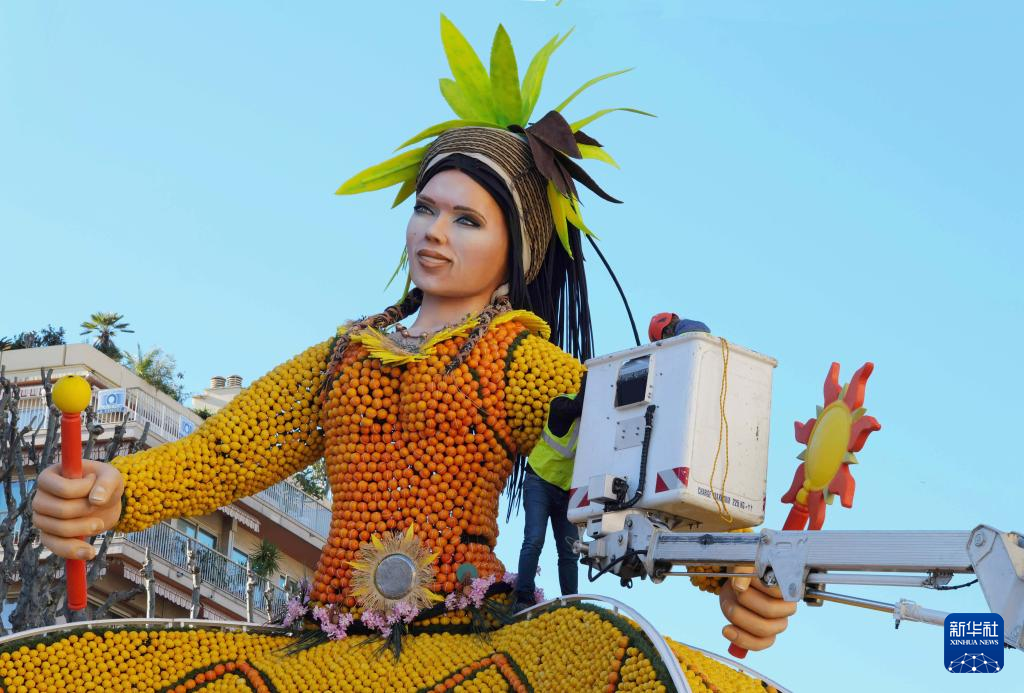 2月9日,工作人员在法国南部小城芒通装饰柠檬节艺术装置。 新华社发(塞尔日·阿乌齐摄)