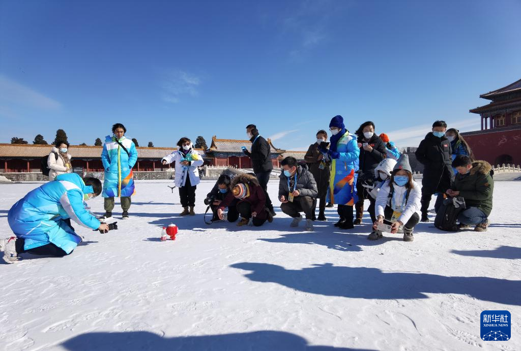 太和殿前,冰雪覆盖下的紫禁城魅力尽显。雪地里,记者们仿佛置身冰雪“赛场”,拿起相机竞相记录。有记者将自己携带的奥运吉祥物“雪容融”置于雪地上,红色的吉祥物与雪地殿宇相映成趣,吸引了众人的目光。