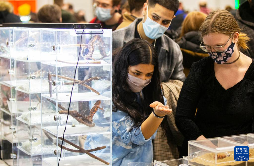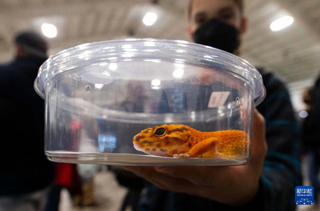 2月27日,在加拿大米西索加举办的爬行动物展上,一名女子展示购买的壁虎。 当日,2022年多伦多爬行动物展在大多伦多地区的米西索加举行,展出不同种类的蛇、龟、壁虎等爬行动物,吸引了众多爱好者参加。 新华社发(邹峥 摄)