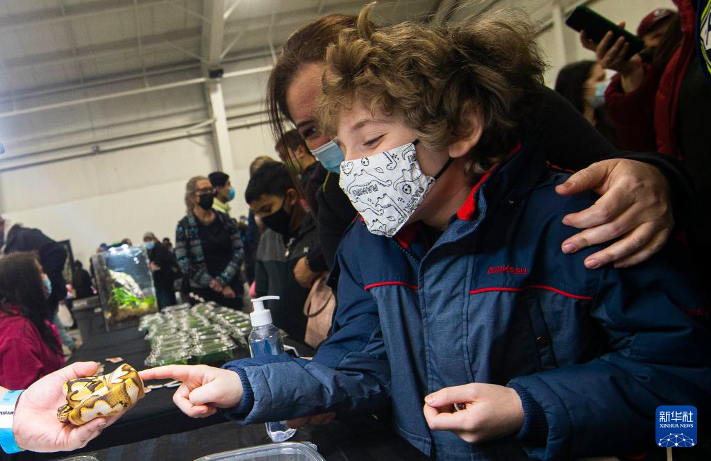 2月27日,一名男孩在加拿大米西索加举办的爬行动物展上触摸一条蛇。 新华社发(邹峥 摄)