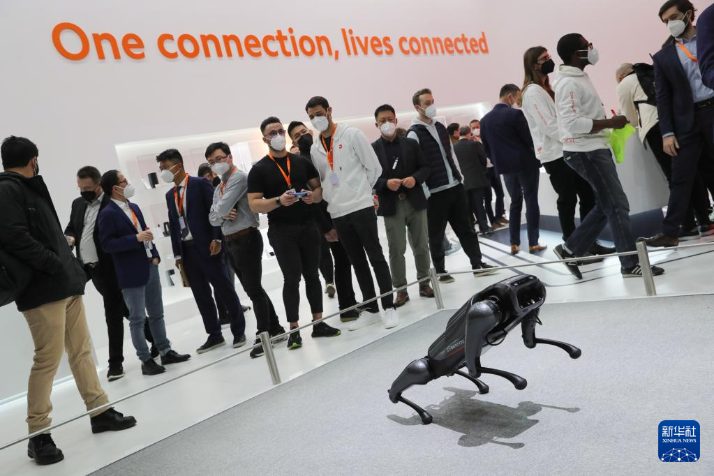 3月1日,在西班牙巴塞罗那举行的2022世界移动通信大会上,人们在小米展区观看CyberDog仿生四足机器人。 新华社记者 郑焕松 摄