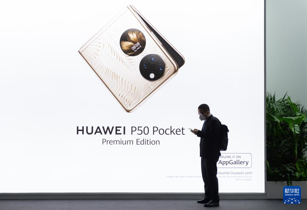 3月1日,在西班牙巴塞罗那举行的2022世界移动通信大会上,参观者在华为折叠屏手机海报旁停留。 新华社发(古斯塔沃·巴连特 摄)