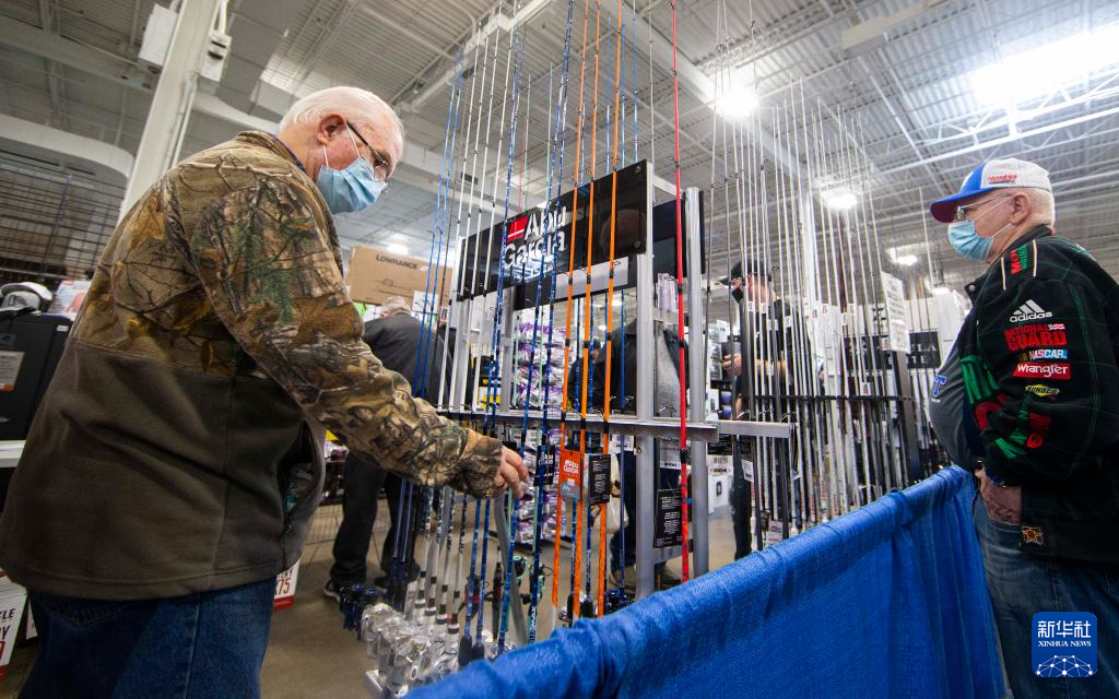 3月17日,一名男子在加拿大米西索加举行的多伦多户外运动展上挑选鱼竿。 新华社发(邹峥 摄)