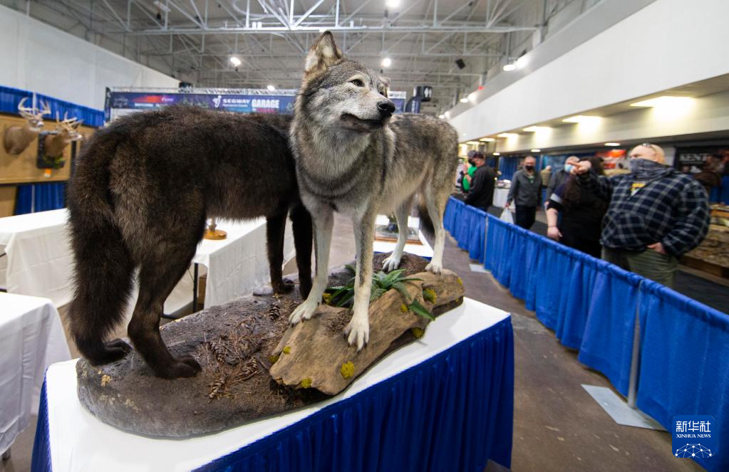 3月17日,观众在加拿大米西索加举行的多伦多户外运动展上观看动物标本。 新华社发(邹峥 摄)