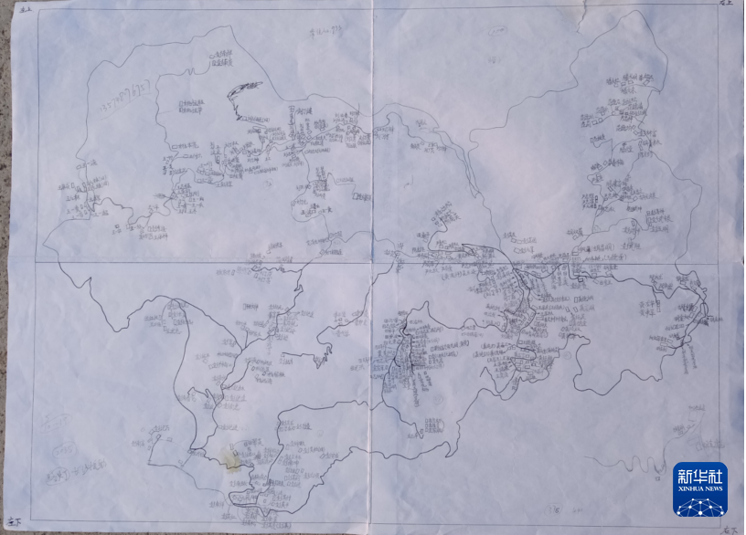 有的组在山坳,有的组在山坡,彭海斌每走一段路就在图上描一段,哪儿拐弯,哪儿直行都在图上表现出来。从9张局部图到最后青艾村的整体图,彭海斌花了近2个月的时间绘制完成。
