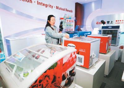 日前,在山东省青岛营上电器有限公司,营销人员通过广交会直播平台推介出口海外市场的冰柜产品。梁孝鹏摄(人民视觉)