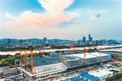 近日,位于广东省广州市海珠区的广交会展馆四期项目西地块钢结构工程全面封顶。该项目建成后将新增展位6000多个。图为广交会展馆四期项目工程现场一派忙碌。魏劲松摄(人民视觉)