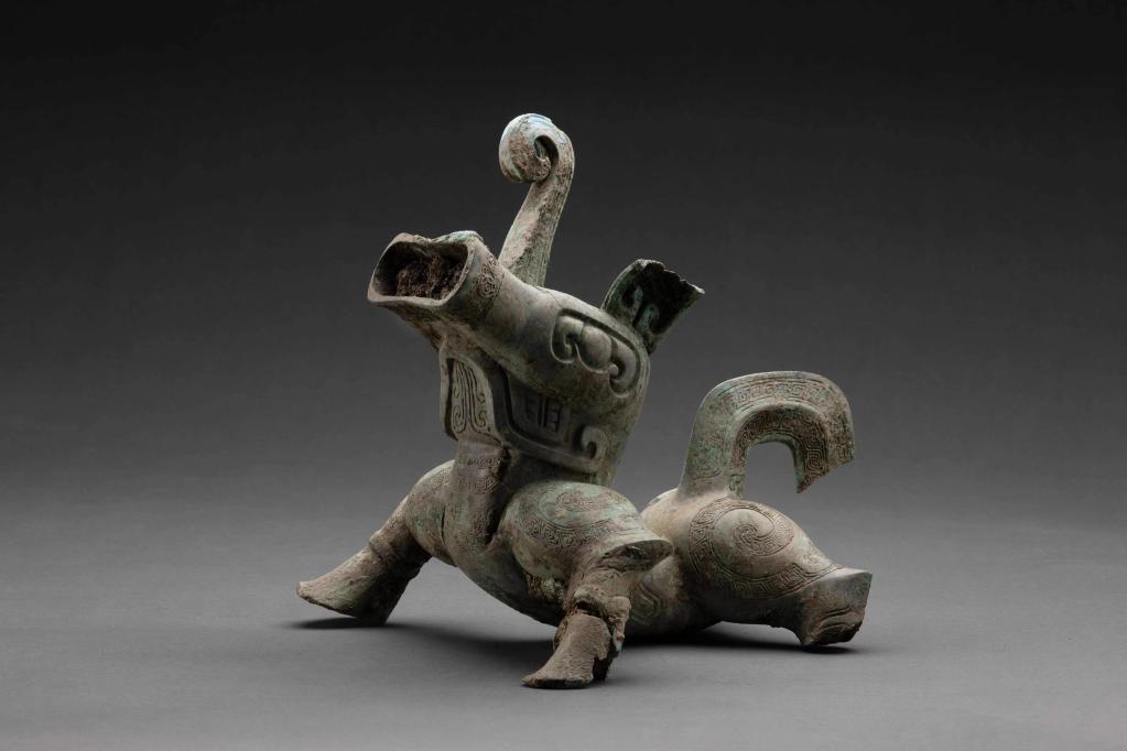 这只“萌兽”出土于三星堆3号“祭祀坑”坑底,长28.5厘米、高26.4厘米、宽23厘米,大大的眼睛,嘴巴像一个扁长的“喇叭”,头上还有一撮“呆毛”,体表有云雷纹条带装饰,整体造型昂首挺胸,看起来壮实活泼。