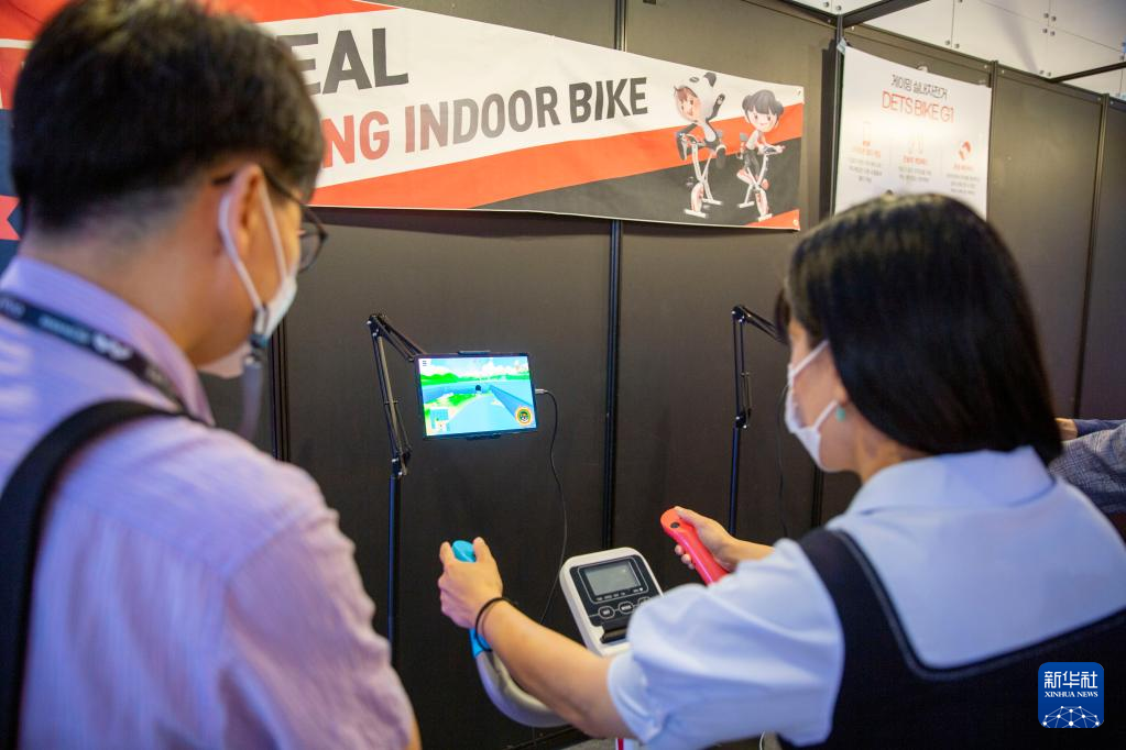 6月15日,参观者在韩国首尔举办的元宇宙博览会上体验室内游戏健身车。当日,为期三天的元宇宙博览会在韩国首尔COEX会展中心开幕,参观者可以在展商搭建的购物、教育、旅游、媒体、娱乐、制造、医疗等场景中体验元宇宙相关技术。新华社记者 王益亮 摄