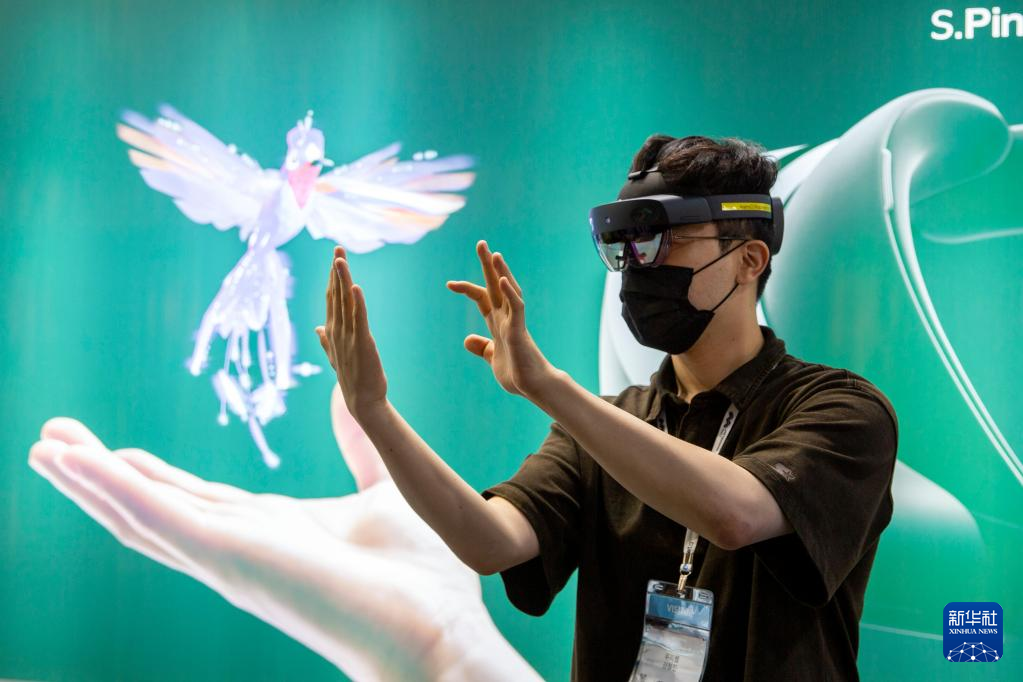 6月15日,参观者在韩国首尔举办的元宇宙博览会上体验混合现实头显设备。当日,为期三天的元宇宙博览会在韩国首尔COEX会展中心开幕,参观者可以在展商搭建的购物、教育、旅游、媒体、娱乐、制造、医疗等场景中体验元宇宙相关技术。新华社记者 王益亮 摄