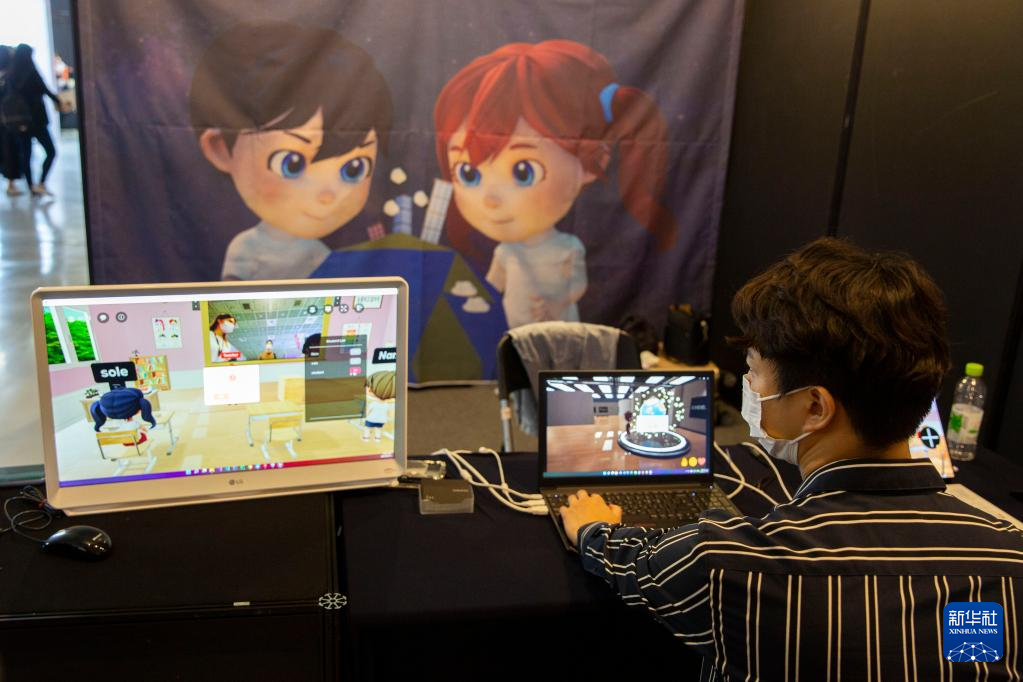 6月15日,参展商在韩国首尔举办的元宇宙博览会上展示虚拟课堂。当日,为期三天的元宇宙博览会在韩国首尔COEX会展中心开幕,参观者可以在展商搭建的购物、教育、旅游、媒体、娱乐、制造、医疗等场景中体验元宇宙相关技术。新华社记者 王益亮 摄