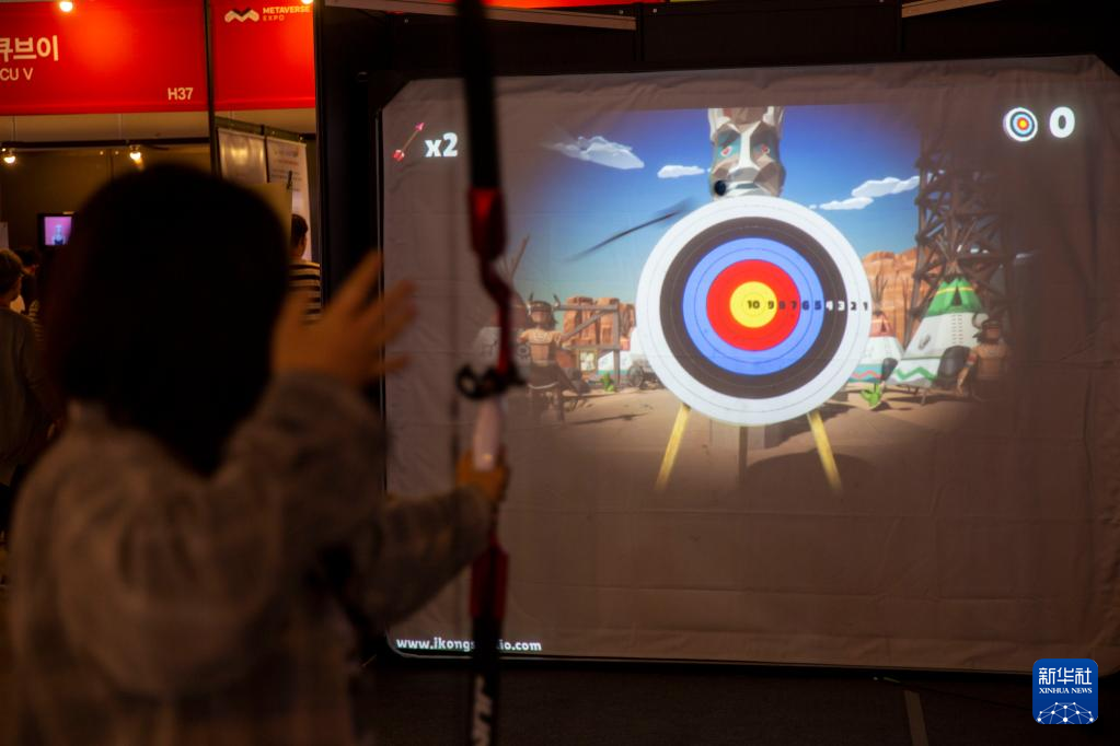 6月15日,参观者在韩国首尔举办的元宇宙博览会上体验模拟射箭游戏。当日,为期三天的元宇宙博览会在韩国首尔COEX会展中心开幕,参观者可以在展商搭建的购物、教育、旅游、媒体、娱乐、制造、医疗等场景中体验元宇宙相关技术。新华社记者 王益亮 摄