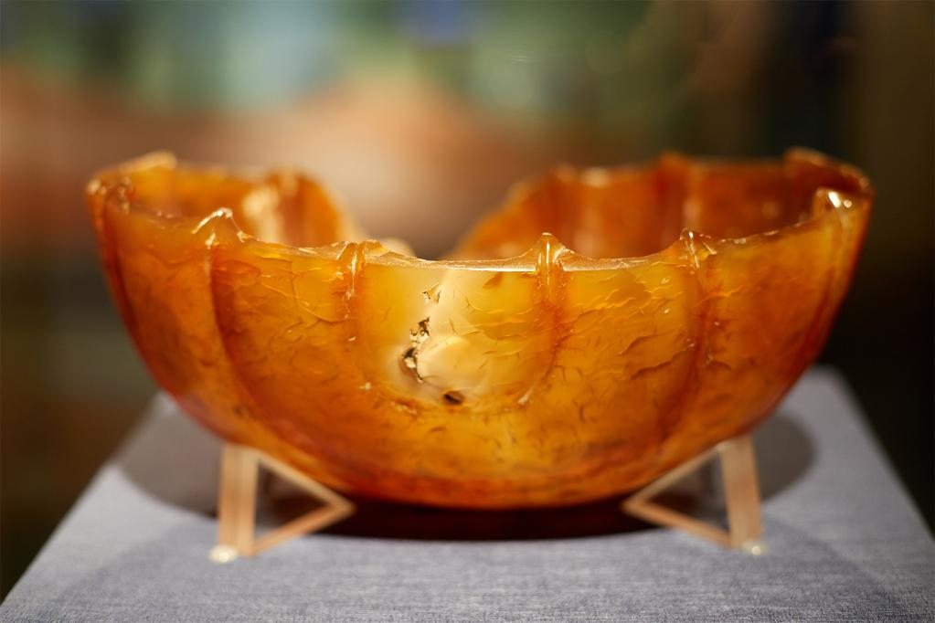 图为青海省都兰县热水墓群血渭一号墓出土的玛瑙十二曲长杯。中国丝绸博物馆供图