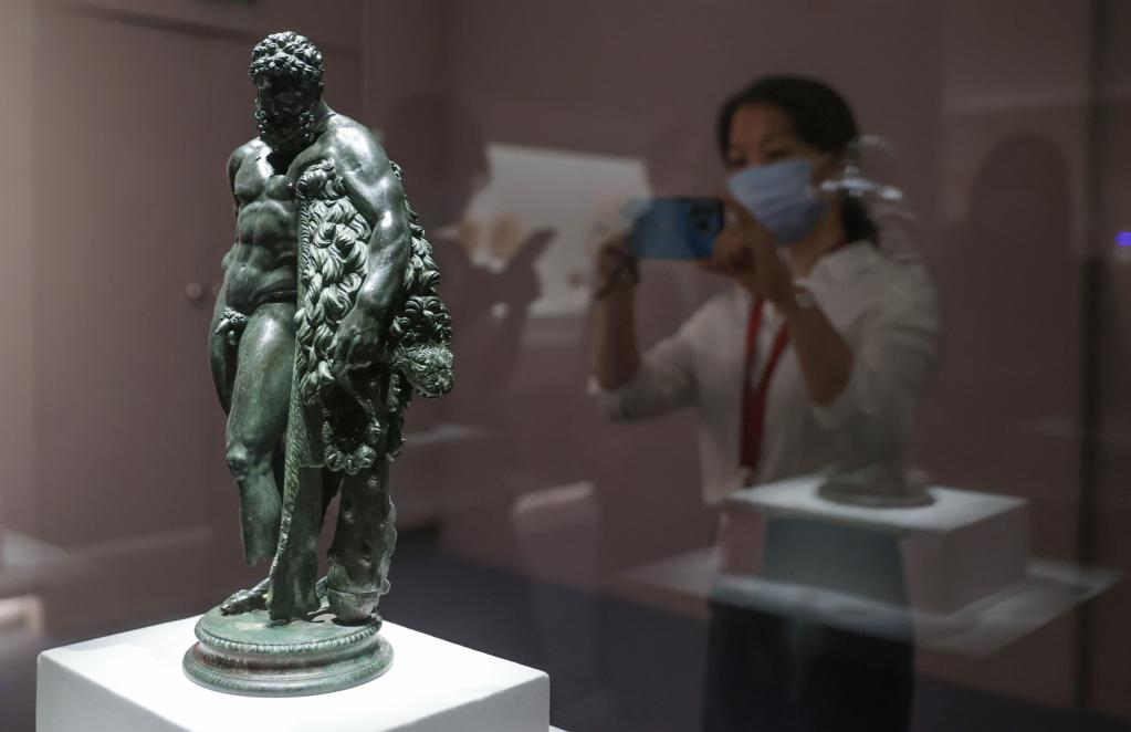 7月11日,参观者在展览上拍摄展品“赫拉克勒斯休憩像”。
