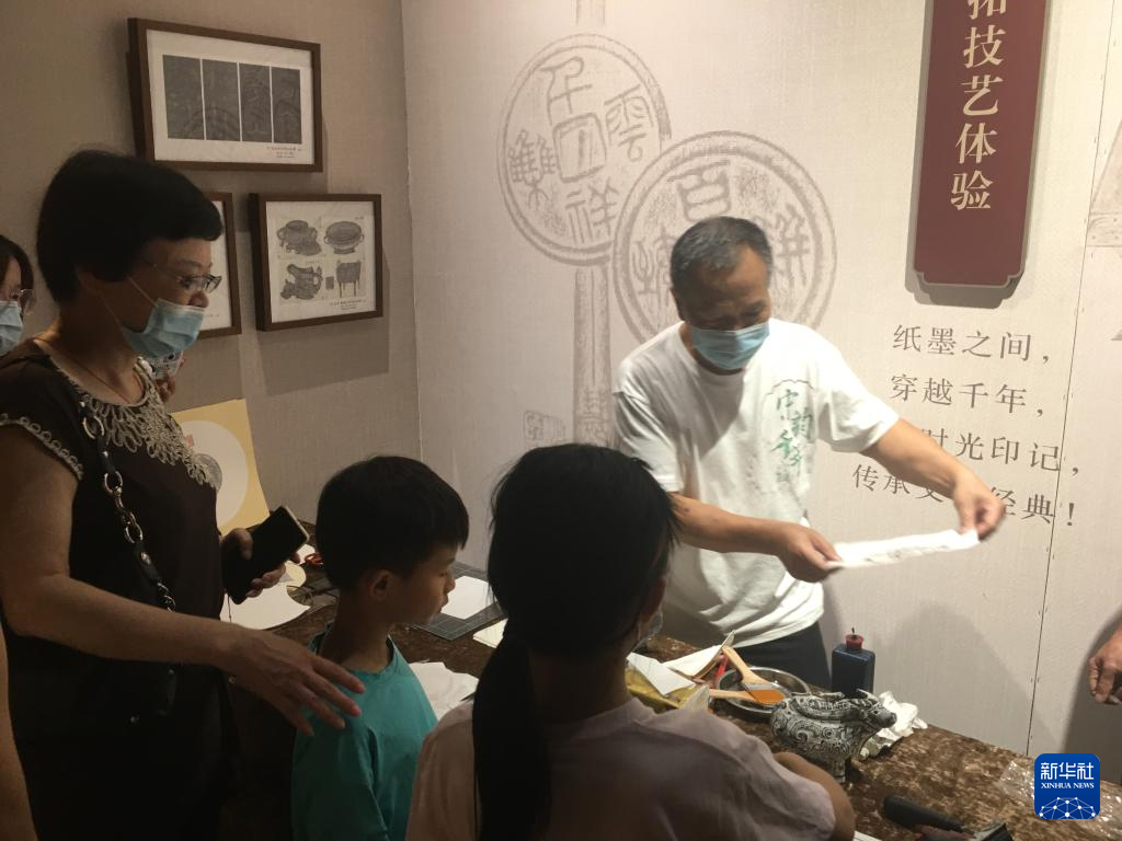 观众在展览现场体验传拓技艺。新华社记者 冯源 摄